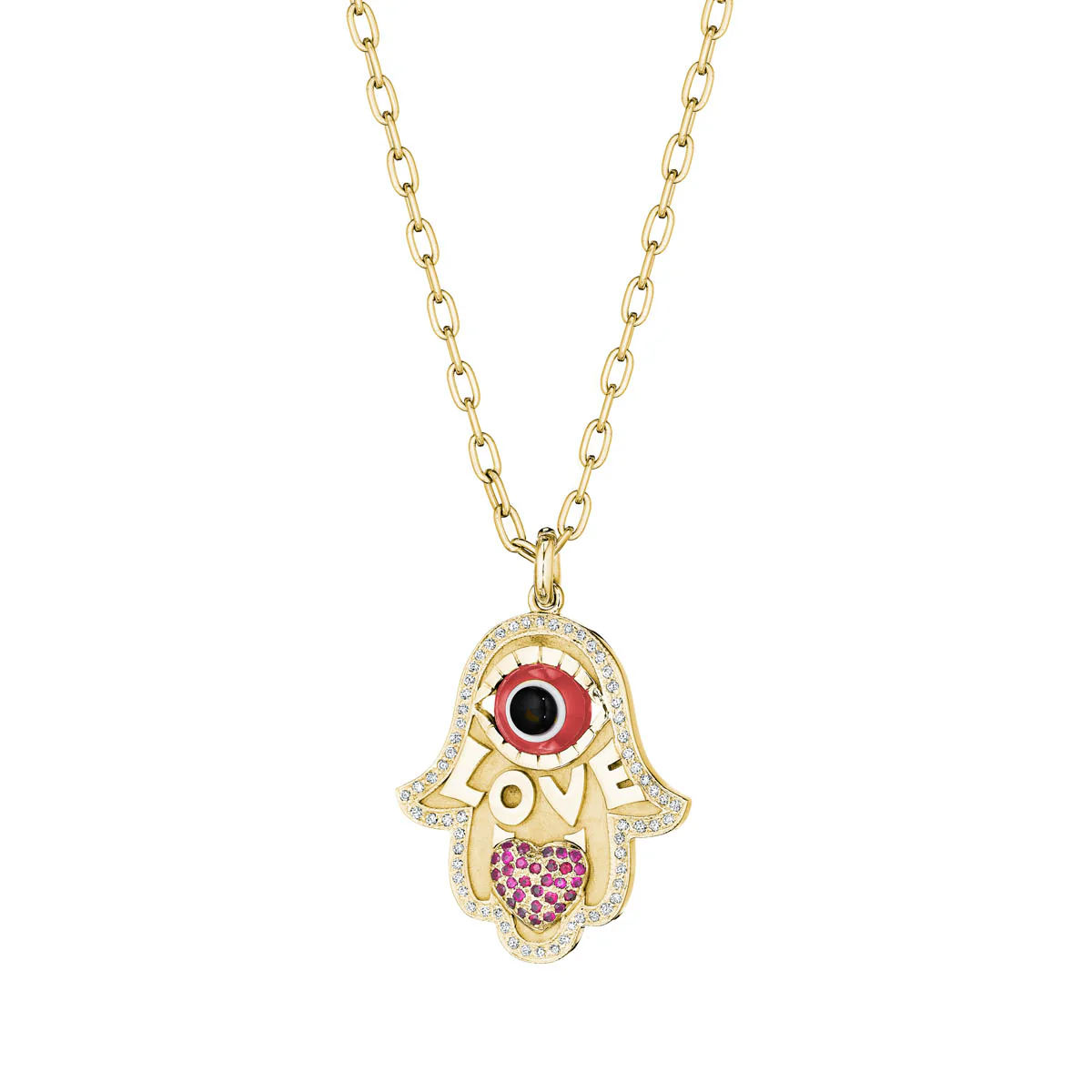 This medium-scale necklace features a refined Hamsa silhouette in 18K gold with a pavé-set heart and center eye motif. Sculpted “Love” lettering links the heart and eye, creating a balanced, graphic composition that feels modern while still distinctly feminine. The open design keeps the piece light on the neckline, with pavé detailing adding just the right amount of sparkle.
